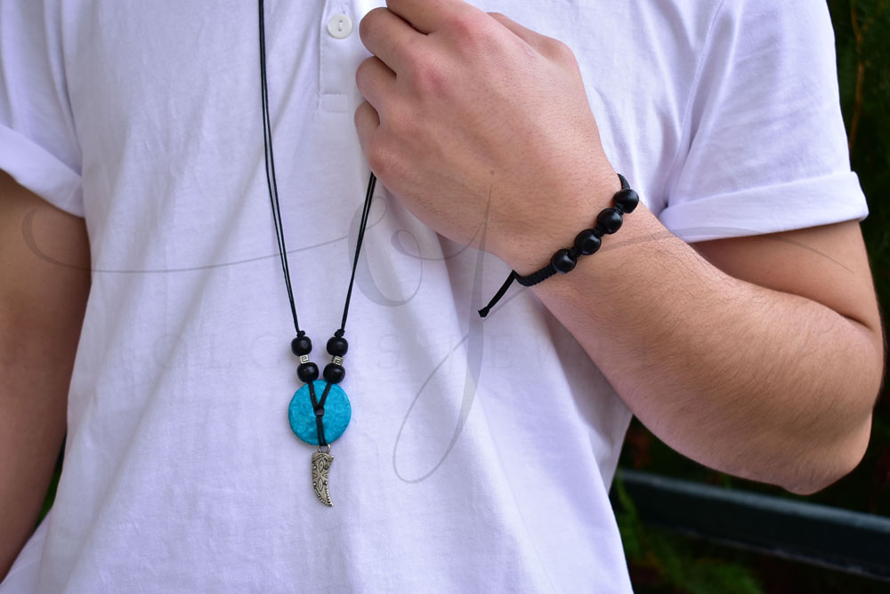 Ανδρικό βραχιόλι με μαύρες ξύλινες χάντρες και μακραμέ με μαύρο κερωμένο νήμα