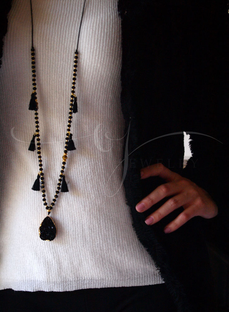 Κολιέ μακρύ με χρυσά στοιχεία, μαύρα και χρυσά κρύσταλλα, μαύρο πέτρωμα ανάγλυφο και φουντίτσες