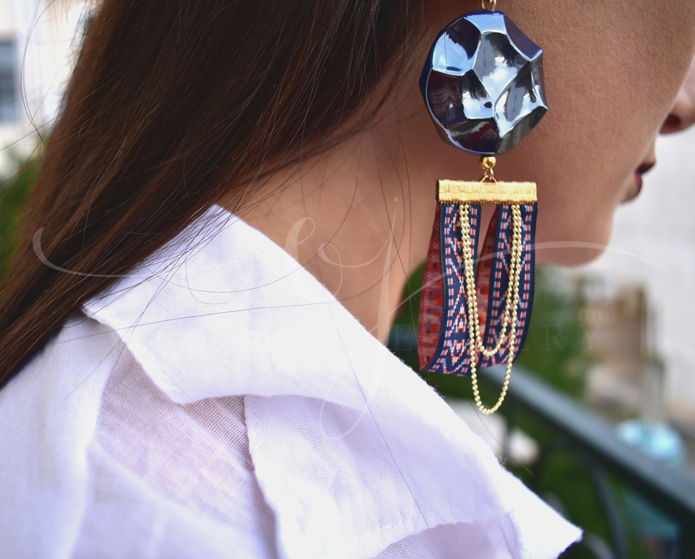 Σκουλαρίκι με χρυσά στοιχεία, μπλε ακρυλική χάντρα και μπλε-σομόν κορδέλα